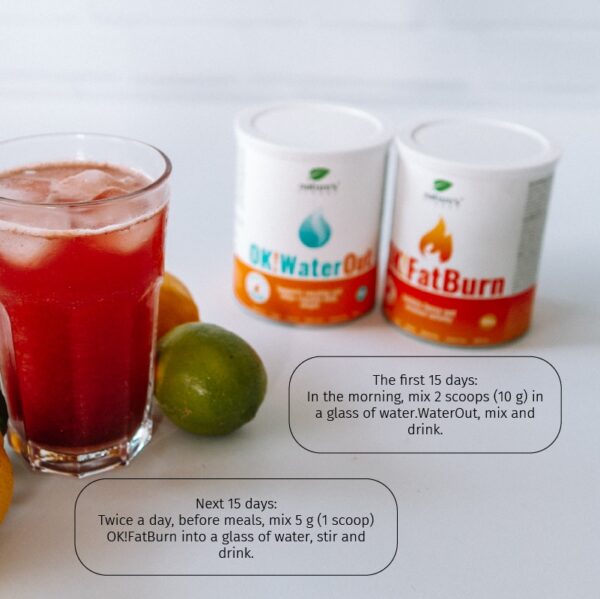 To gange om dagen, før måltider, tilsættes 5 g (1 skefuld) OK! FatBurn til et glas vand, rør rundt og drik.