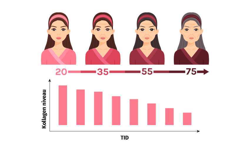 Fra midten af 20’erne begynder kroppens naturlige produktion af kollagen gradvist at falde som en del af den normale aldringsproces. Dette fører til fine linjer, rynker og mere skrøbelige negle. Kollagenniveauet falder med ca. 1 % om året og hurtigere før og efter overgangsalderen.