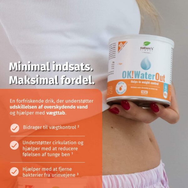 OK!Waterout er en naturlig drik, der indeholder effektive naturlige ingredienser, som sammen fremmer en god cirkulation¹, hjælper med at kontrollere kropsvægten² og understøtter udskillelsen af vand gennem urinvejene³.