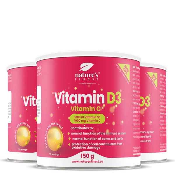 Med vitamin D3 og Vitamin C i pulverform sikrer vi den bedste absorption, som starter lige så snart det kommer i kontakt med vores spyt. Den primære rolle af vitamin D er at opretholde homeostasis og konstant koncentration af calcium og fosfater i plasma, mens Vitamin C fungerer som en stærk antioxidant.